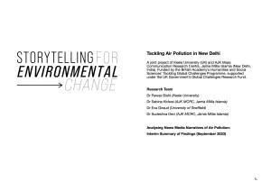 This research project (2021-2024) examines the potential of participatory approaches to storytelling in tackling the catastrophic challenge of urban air pollution confronting India. The study has a focus on New Delhi, the world’s most polluted city, and is specifically designed to explore the possibilities and challenges generated by the COVID-19 pandemic in relation to environmental advocacy.